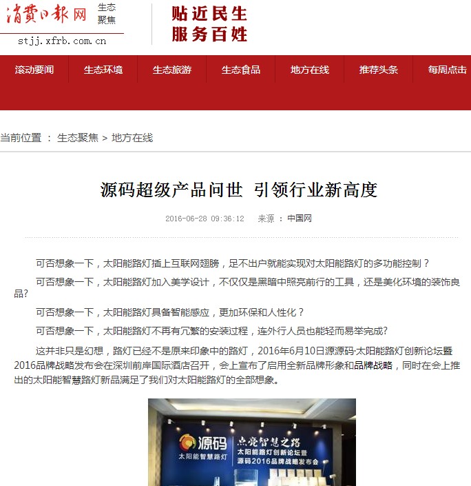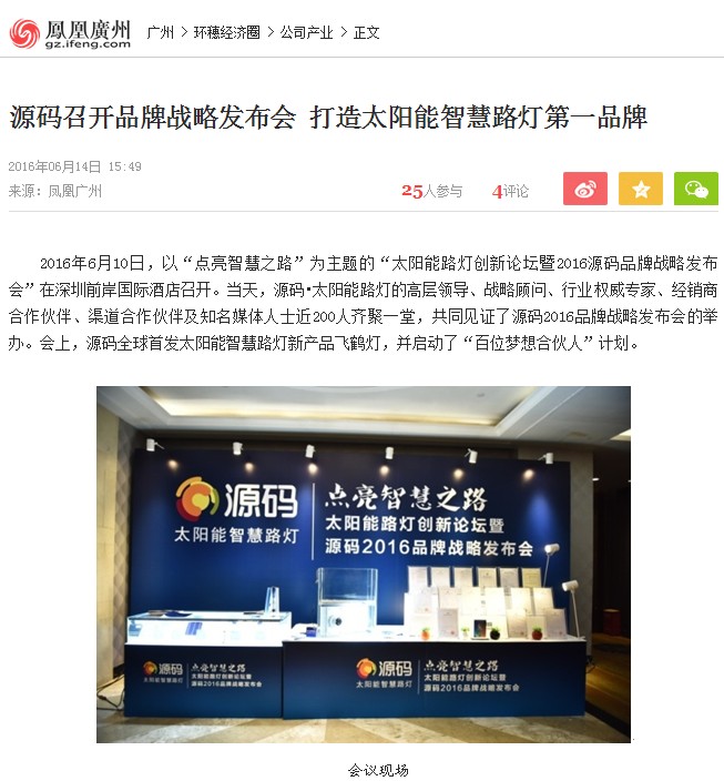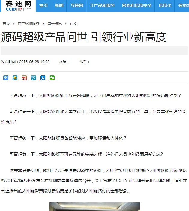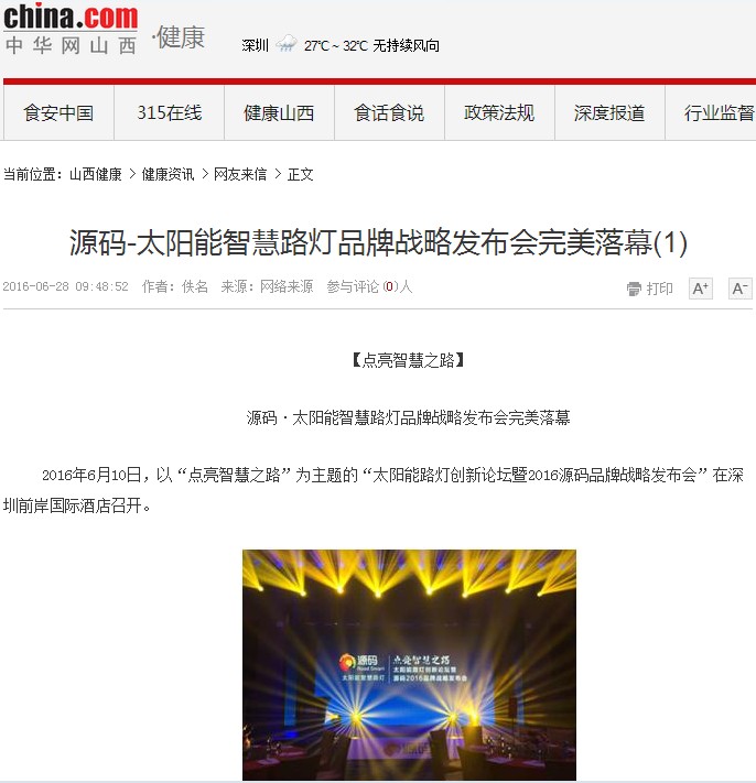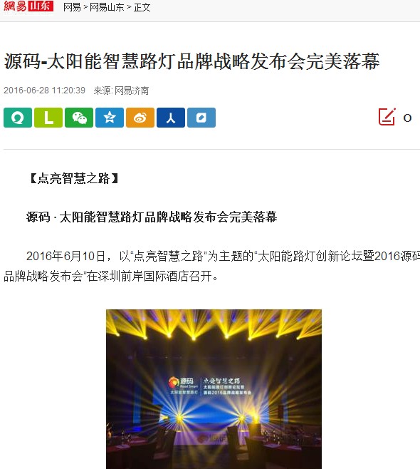 继源码在深圳成功举行太阳能路灯创新论坛暨源码2016品牌战略发布会后,引起了各大媒体和行业的广泛关注,行业专家柴钰教授表示,此次源码发布会已经颠覆了行业对传统太阳能路灯的认知,对太阳能路灯行业的发展指明了方向。在各大媒体的争相报道下,网上掀起一片关于“源码”的信息狂潮。