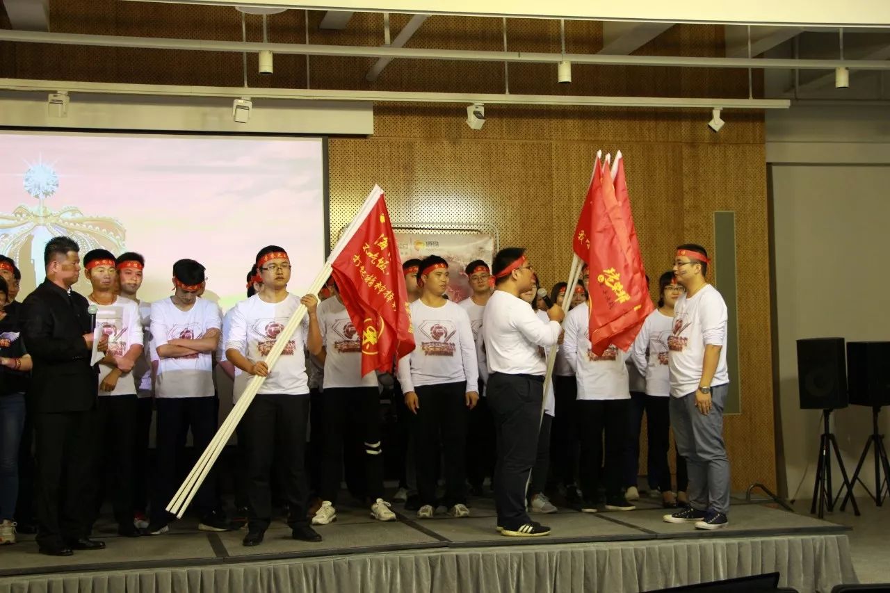 在呼喊公司活动口号的环节,每个部门,每个战士都在高喊口号,喊得嗓子都已沙哑:风起云涌,鹰击长空,人人锐士,唯我称雄!杀!杀!杀!在内外贸主管整队授旗环节,两位主管情绪异常高亢,声音都已经在颤抖,可是那颤抖的声音却振彻会场,激励士气,吓破敌胆。在两位军团长情绪的渲染下,各个队长也表现出大无畏的誓死精神,接过队旗,喝下“壮士断腕”一般的军令酒,骄傲的在会场挥舞自己队伍的旗帜。