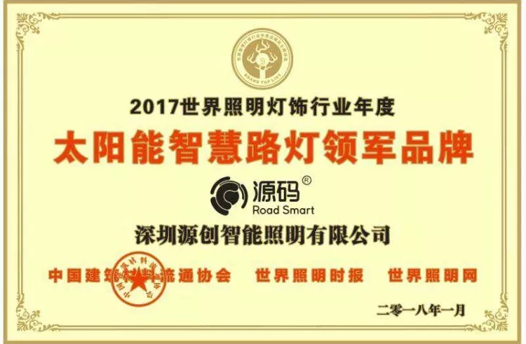 2019年1月9日,第十七届深圳企业创新纪录成果发布会暨深圳工业总会、深圳市先进制造业联合会、深圳市企业品牌建设促进会2018年度会员大会在深圳举行。深圳源创智能照明有限公司,凭借在太阳能路灯创新技术的突出优势获得“深圳企业创新(中国)纪录”奖。