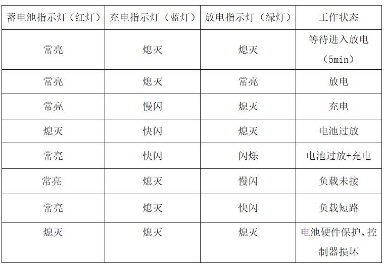 a、所有指示灯不亮,有可能电池过放,电池硬件保护,可第二天白天看指示灯状态,如红灯常亮,蓝灯闪烁,表示灯具正常充电,则灯具正常;如第二天白天看指示灯状态均不亮,灯具有问题,需更换灯具配件。