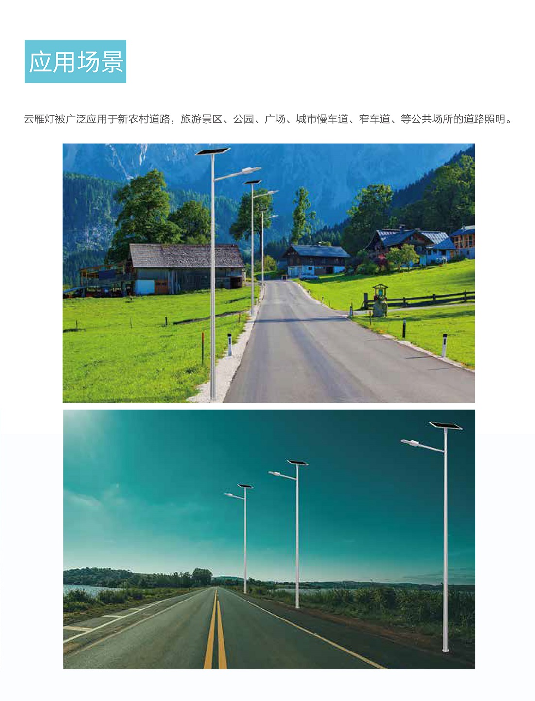 云雁灯作为分体式太阳能路灯,被广泛应用于新农村道路、乡镇道路、城市窄车道,以及传统太阳能路灯替换等场景。